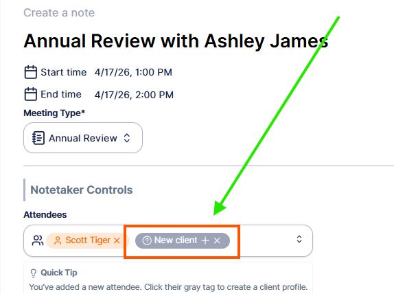 Once created, it will be blue, not grey. The client will automatically be associated with that meeting note and vice versa.