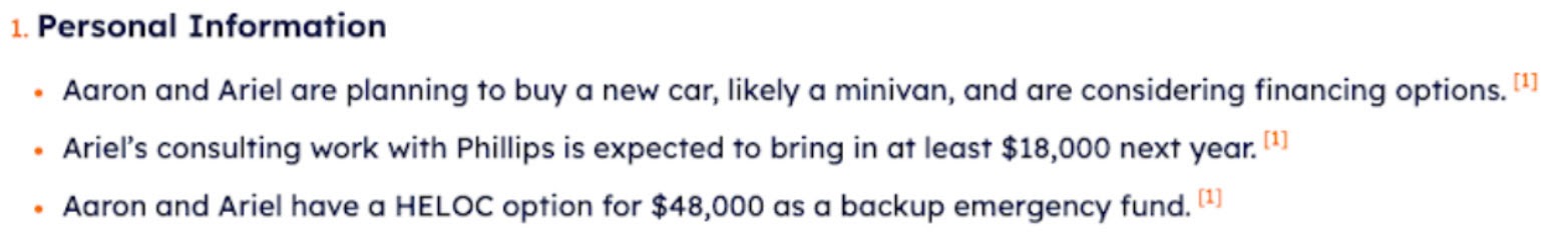 After processing, and refreshing the page (click F5 on a Windows machine or Command-R on a Mac) you will see the generated client information, tasks, and any related notes within Zeplyn. Click on the footnote links (small numbers in superscript) and you’ll be taken to the source within your CRM.