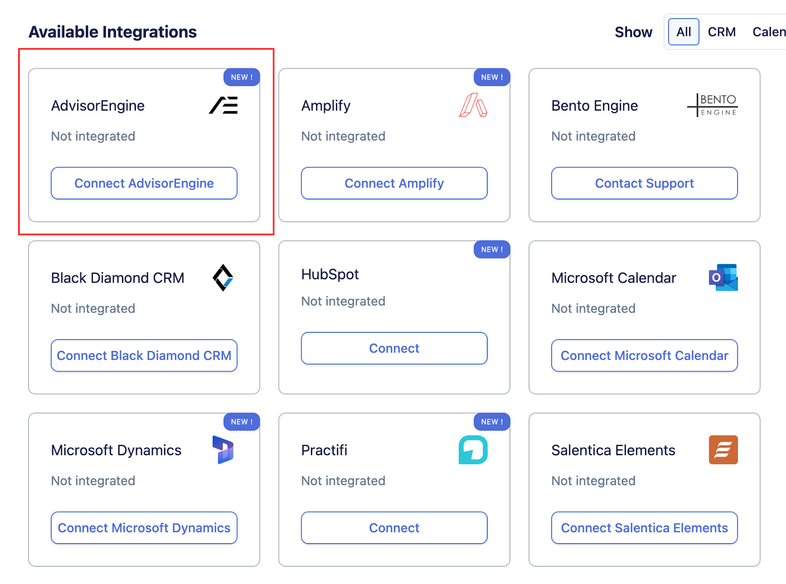 Under Available Integrations, find AdvisorEngine.