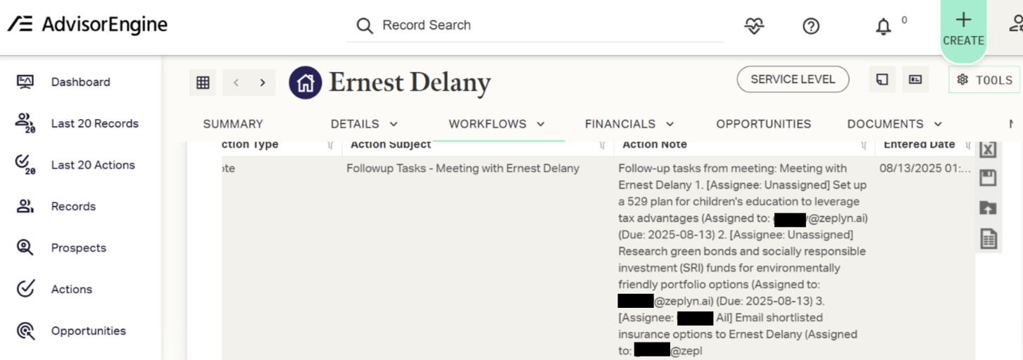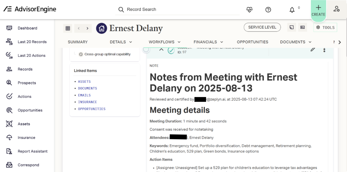 Zeplyn integrates directly with AdvisorEngine so you can sync meeting notes and tasks seamlessly into your CRM.
