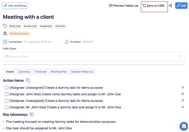 Tasks → Appear as a consolidated Follow-Up Task under the same client account, containing all relevant details from the meeting note.