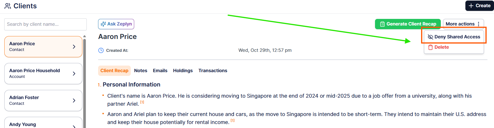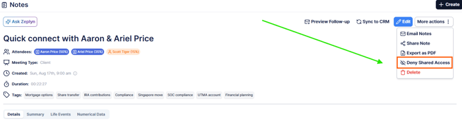The Deny Shared Access feature allows you to make a client or individual meeting note private, even if you are part of a Workgroup. This is useful when you want to limit visibility of sensitive information while still collaborating with your team in other areas.