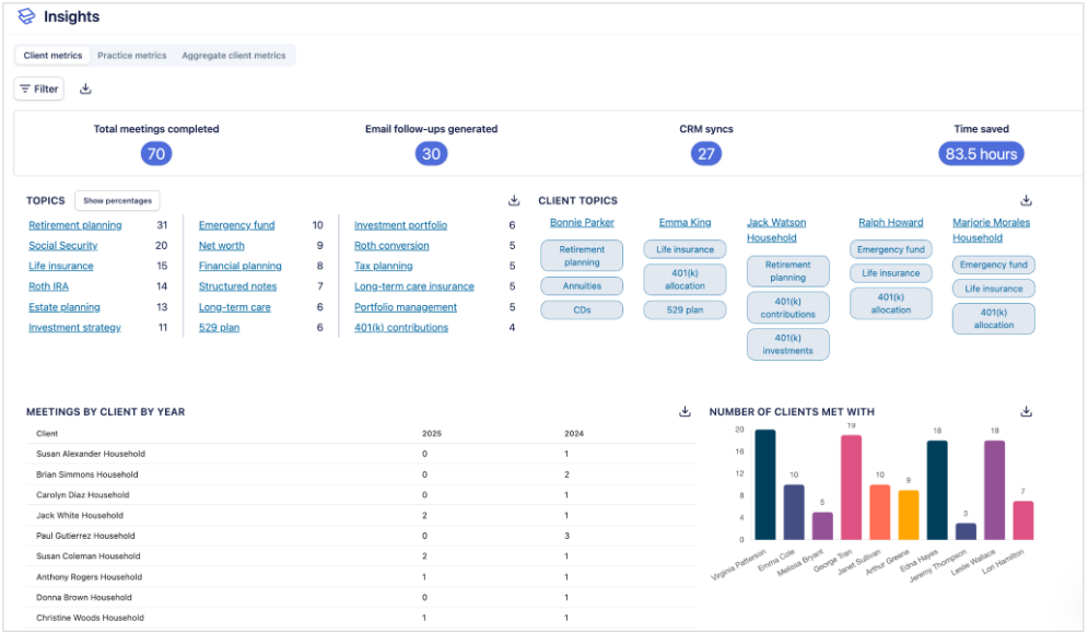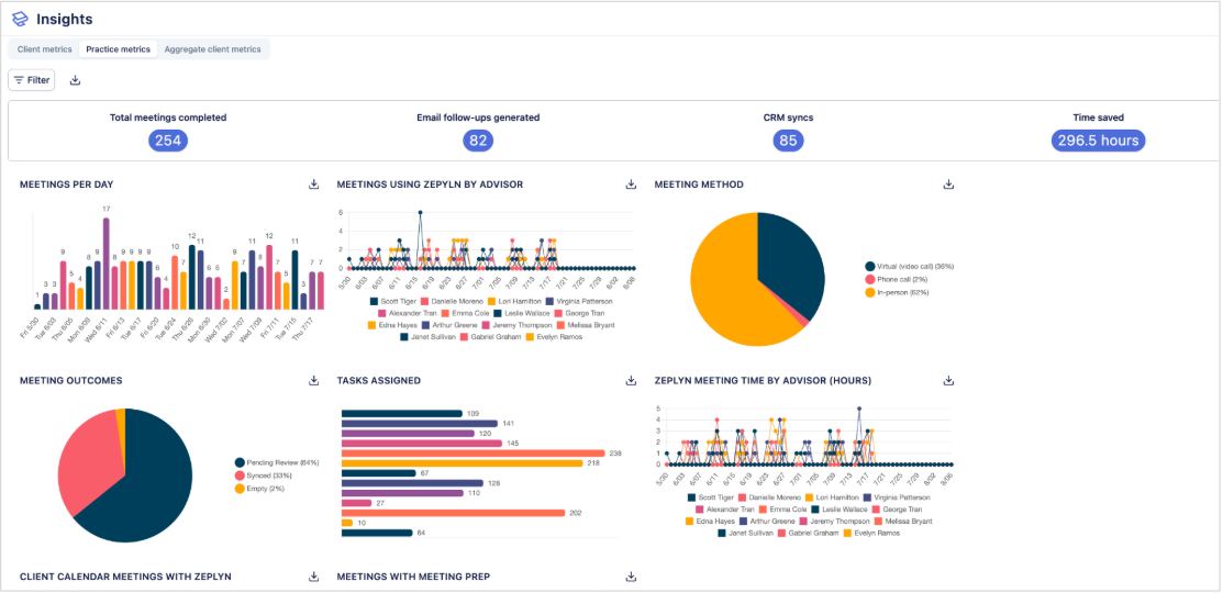 ⚡Tip: Use filters to drill into specific timeframes, advisors, or client groups for more focused insights.