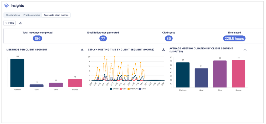 The Practice Intelligence (Insights) Dashboard gives you actionable insights into your practice’s efficiency, client engagement, and meeting outcomes.