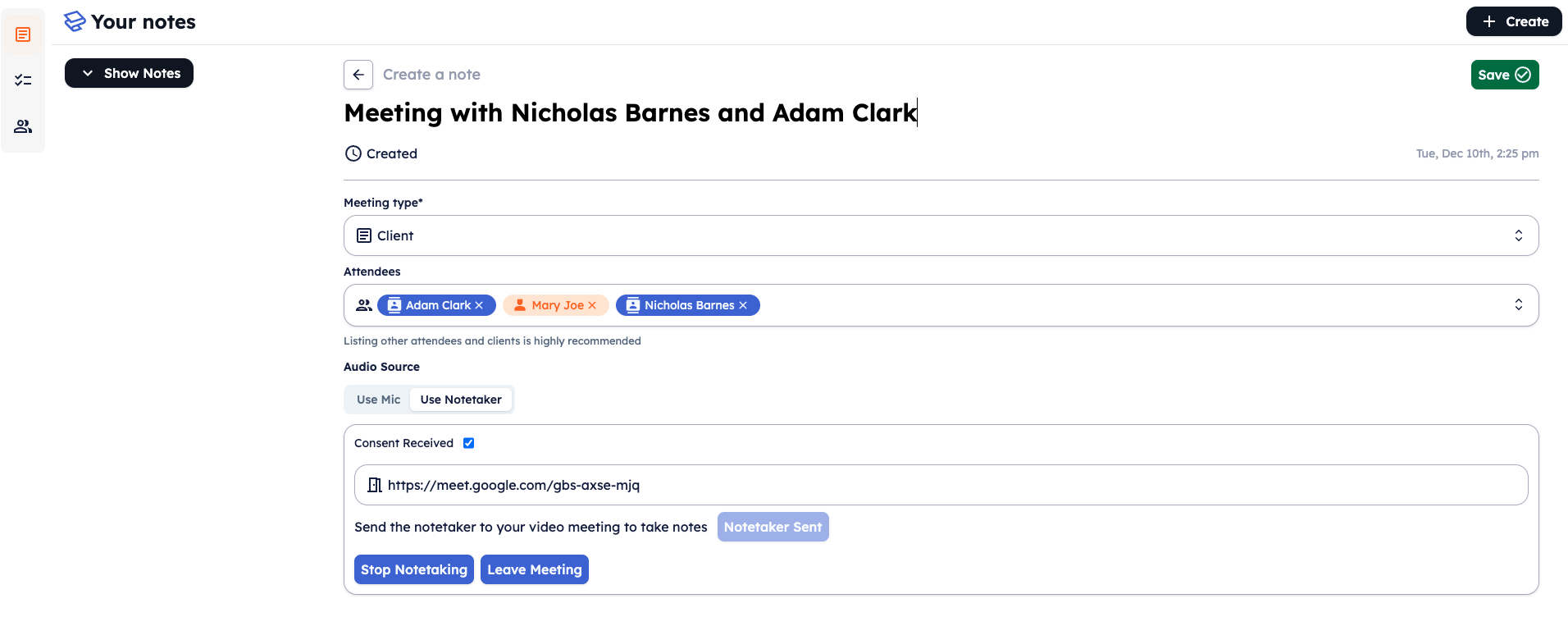 The note will be generated in real-time (typically within 1 minute). Once generated, you can view the note by clicking on the meeting in the left pane.